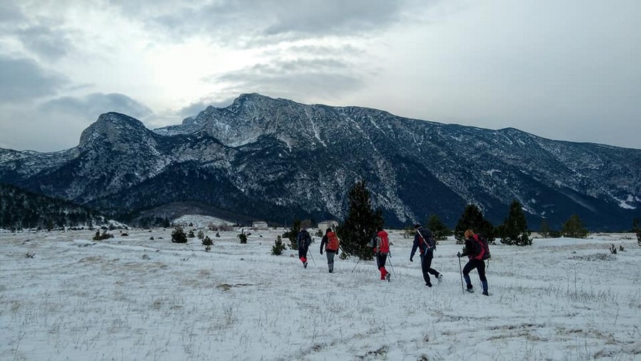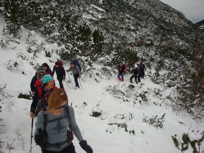 U rano subotnje jutro krećemo put vrha Pločno kao pioniri prvih ovogodišnjih snigova. Dočekala nas je staza sa 20-30cm, mjestimice i preko pola metra, neugaženog snijega tako da pomalo napredujemo rotirajući se na čelu kolone. Nakon 4 sata stižemo malo prije završnog uspona i tu radimo okret. Odlučujemo se ne ići na vrh i icrpiti se do kraja jer bi nas u povratku uhvatio mrak na zahtjevnom i kamenitom terenu što može biti izrazito opasno. Vraćamo se u dom dokrajčiti napravljeni ručak – ipak se kod Mihovilaca znaju prioriteti!
