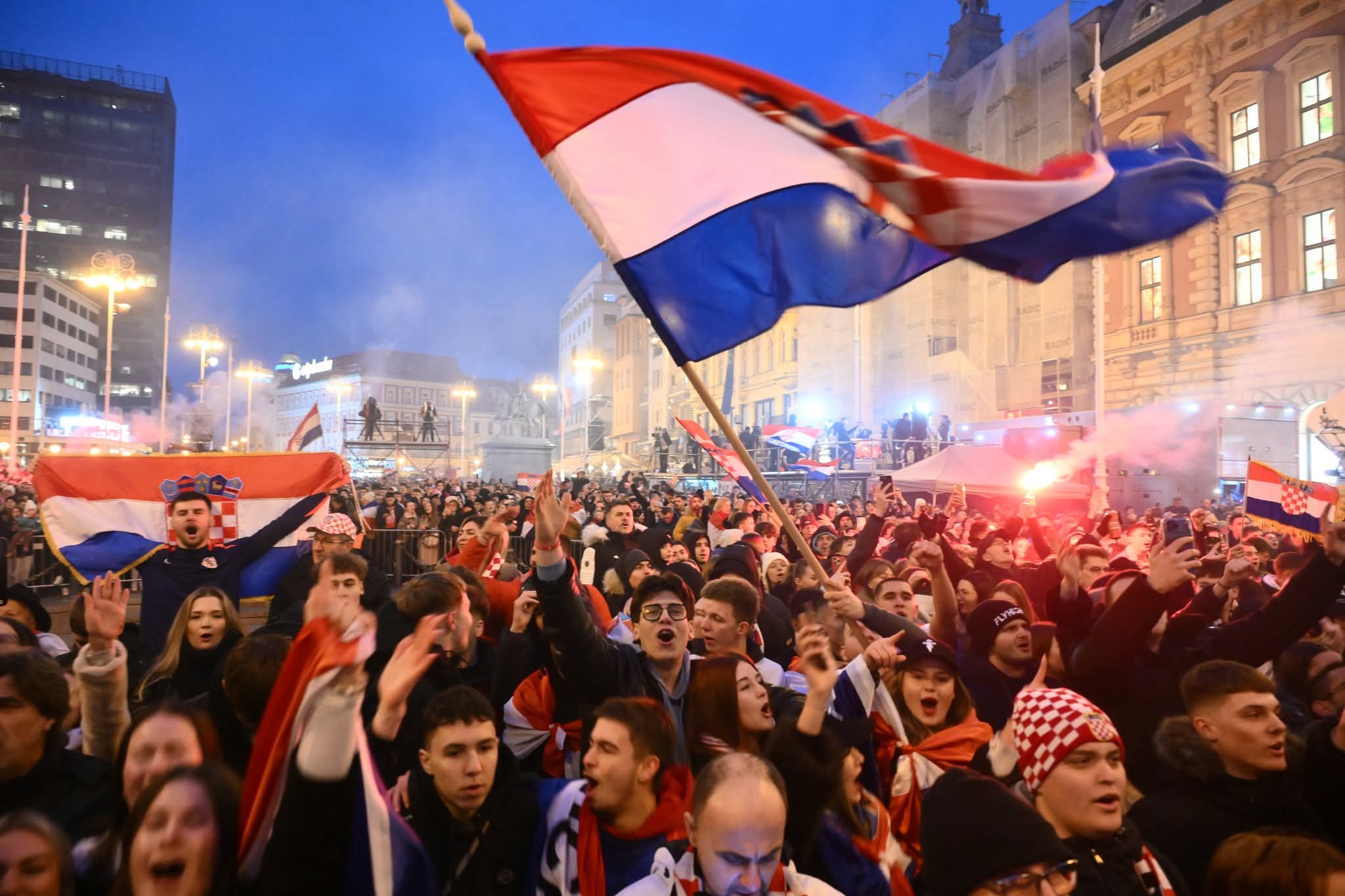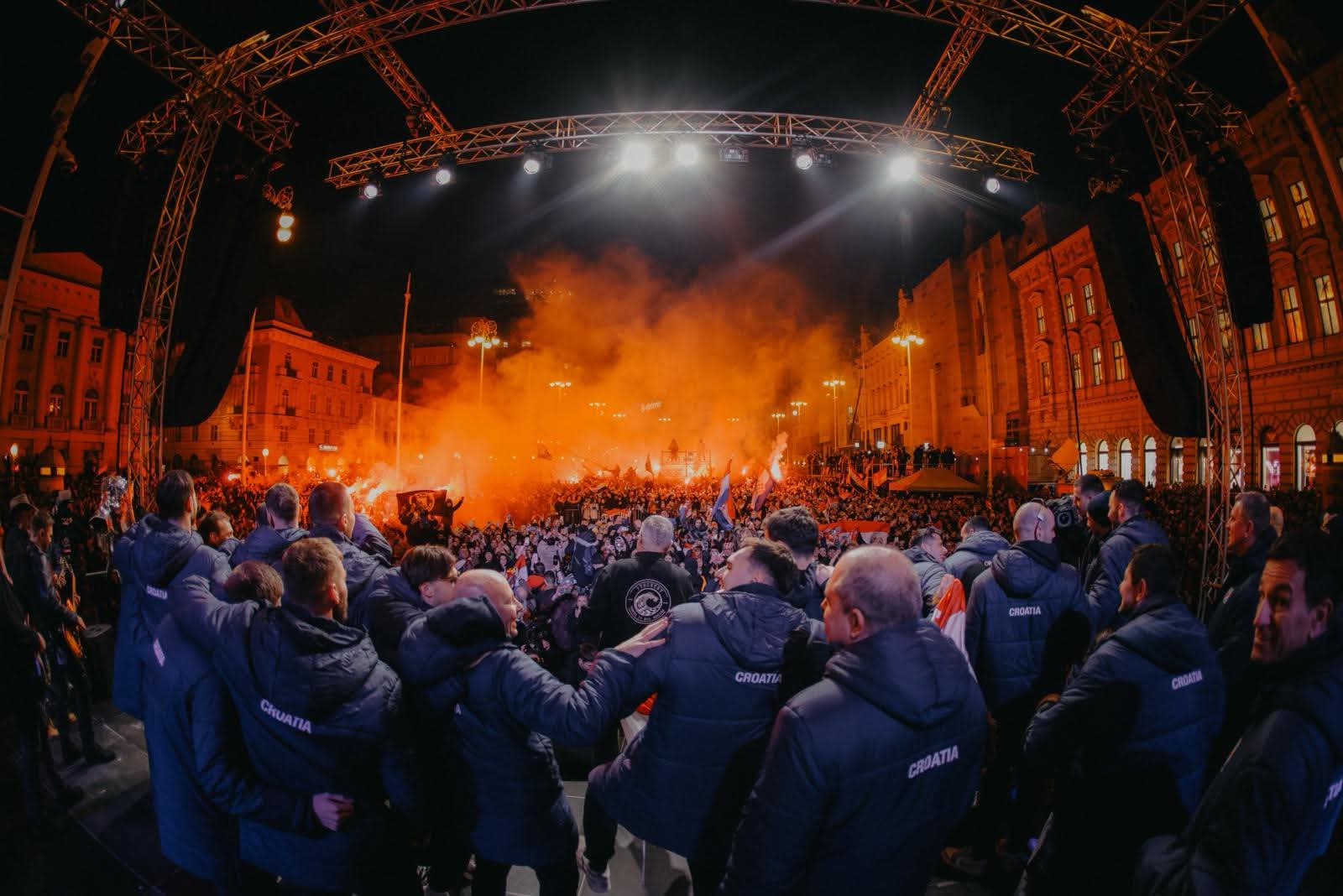Središnji zagrebački trg punio se navijačima još u ranim popodnevnim satima, uz brojne hrvatske zastave s natpisima iz svih krajeva Hrvatske, a ozračje na trgu prije dolaska rukometaša zagrijavali su Zaprešić Boysi i Hrvatske ruže.