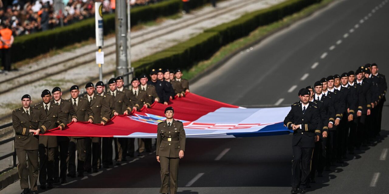 Jedan od najemotivnijih trenutaka vojnog mimohoda u Zagrebu bio je kada su hrvatski branitelji predali golemu zastavu mladim kadetima Hrvatske vojske.