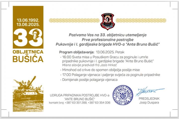 Udruga pripadnika postrojbe Hrvatskoga vijeća obrane „Ante Bruno Bušić“ u petak (13. lipnja) na Posuškom Gracu organizira svečano obilježavanje 33. obljetnice osnivanja Prve profesionalne postrojbe Pukovnije i 1. gardijske brigade HVO-a „Ante Bruno Bušić“.
