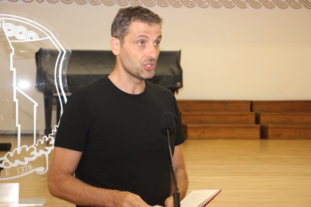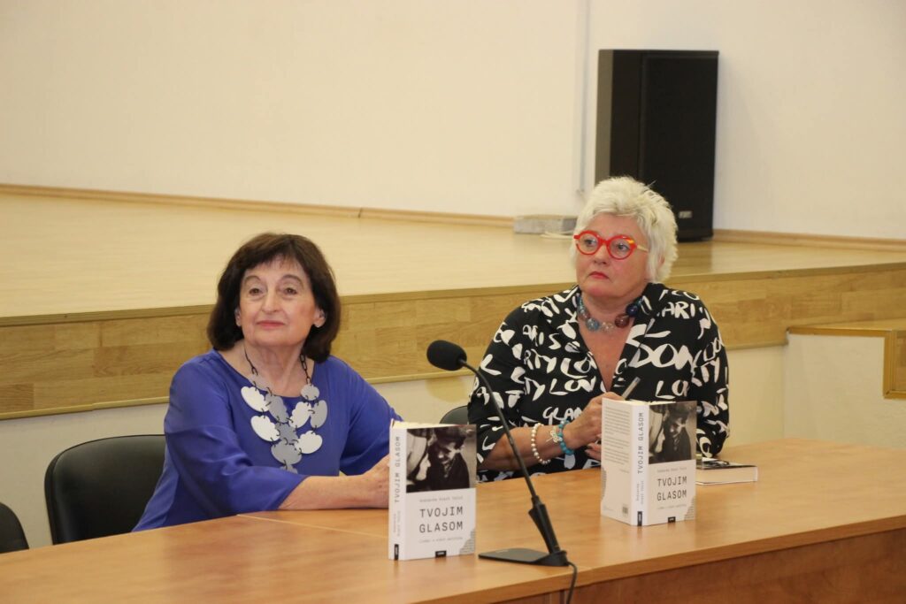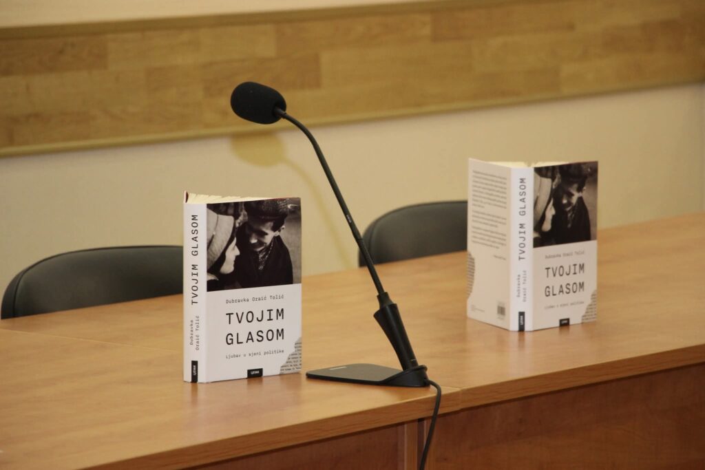 Potom je uslijedilo predstavljanje knjige Tvojim glasom: Ljubav u sjeni politike, autorice Dubravke Oraić Tolić. Uz gospođu Oraić Tolić, o knjizi je govorila i akademkinja Helena Sablić Tomić, a odlomke je interpretirao Robert Kurbaša.