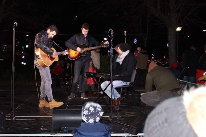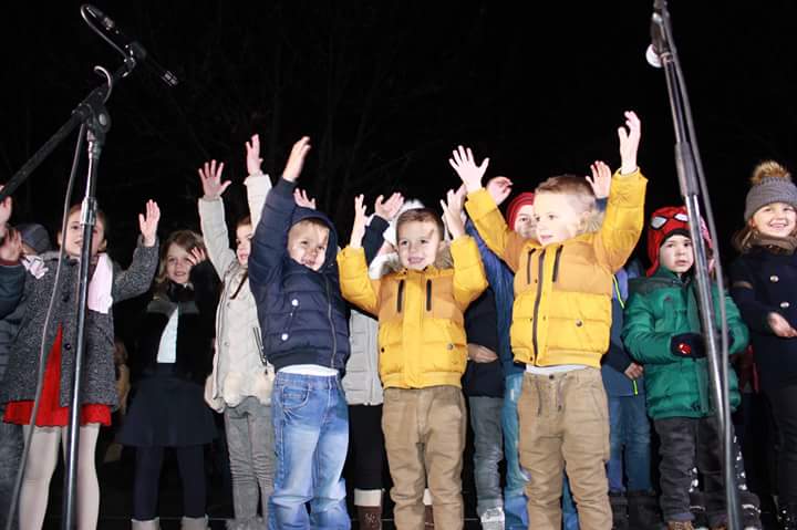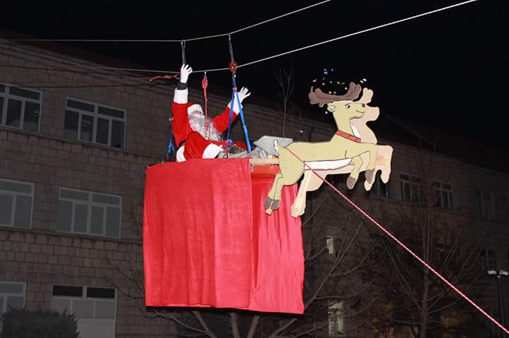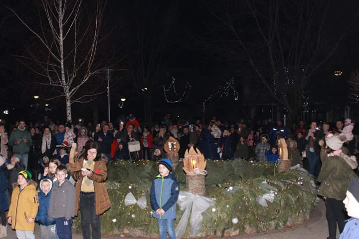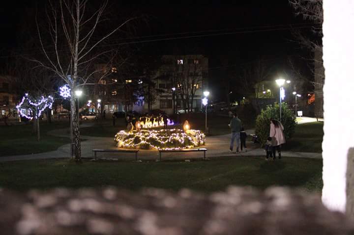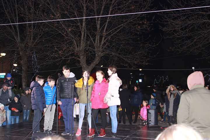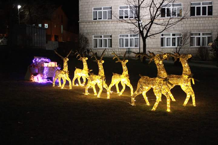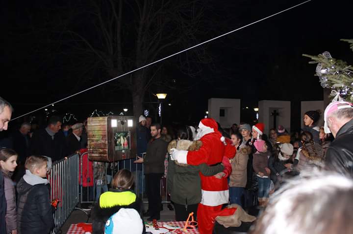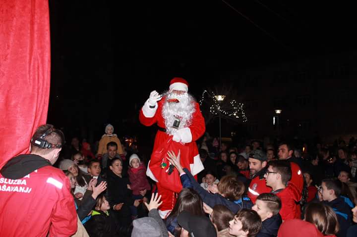 Gradski park večeras je bio ispunjen roditeljima i djecom koji su s nestrpljenjem iščekivali dolazak Djeda Božićnjaka. On se i ove godine spuštao s vrha zgrade srednje škole djeleći pri tom raznorazne slastice mališanima.