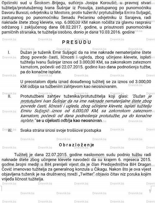 Šušnjar ga je tužio na Općinskom sudu u Širokom Brijegu za klevetu, na što je Suljagić odgovorio protutužbom.