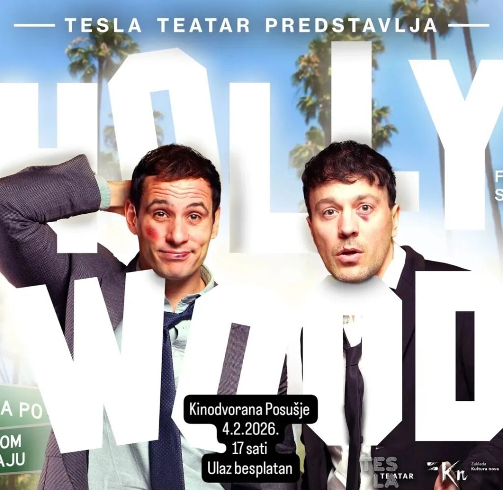 Kazališna komedija po istinitom događaju pod nazivom “Hollywood” bit će izvedena u Posušju u srijedu, 4. veljače, u produkciji Tesla teatra. Predstava će se održati u posuškoj Kinodvorani s početkom u 17 sati, a publici dobru zabavu obećavaju glumci Fabijan Pavao Medvešek i Filip Sertić.